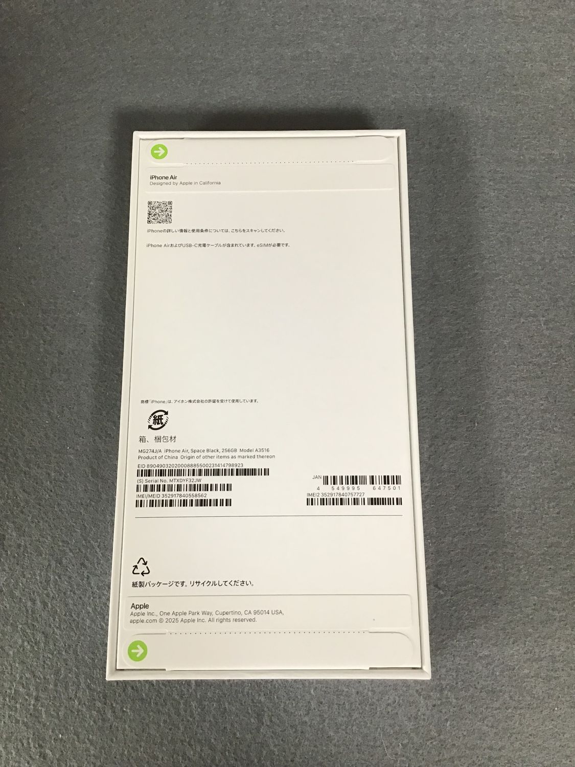 新品未開封 Appleストア版 SIMフリー iPhoneAir 256GB スペースブラック色