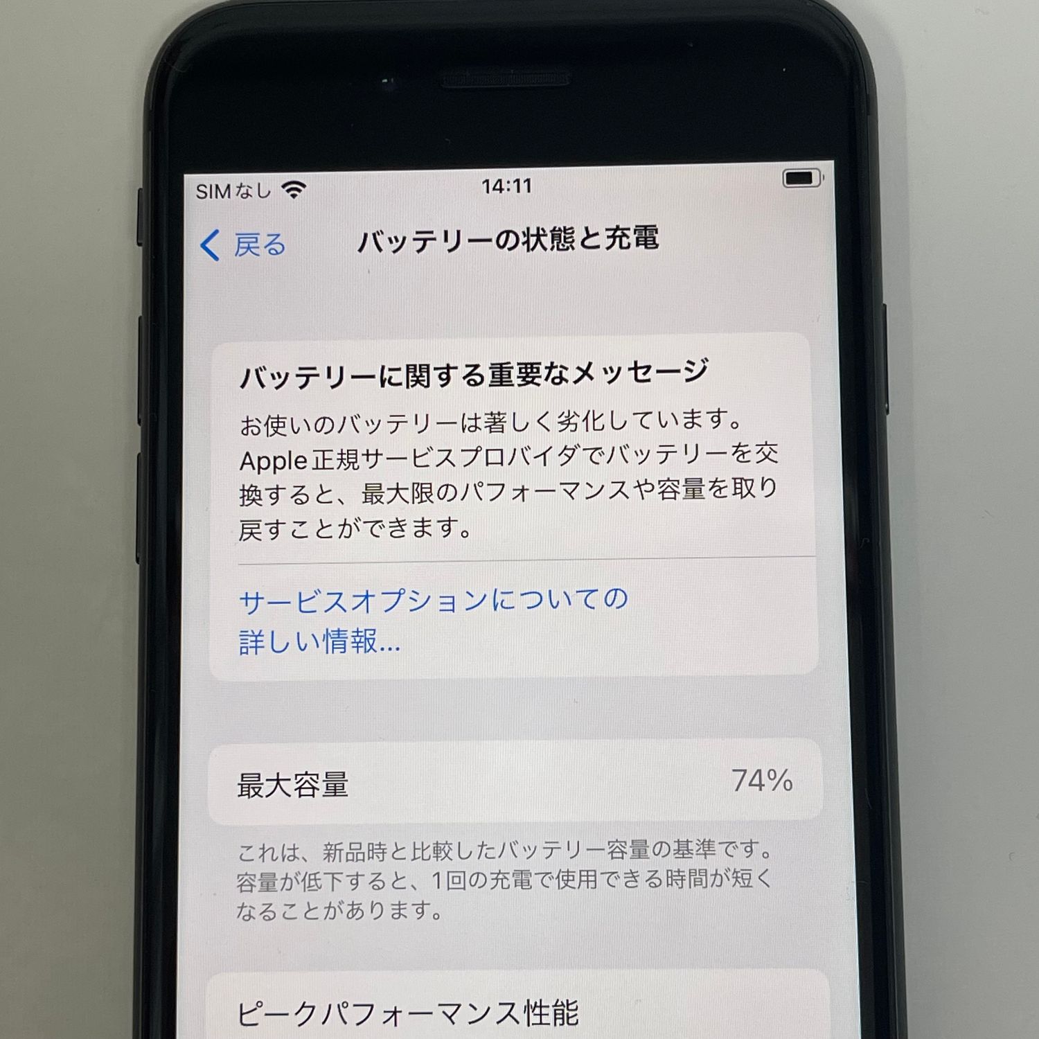 検品時のバッテリーの最大容量は74%、SIMフリー端末になります。
