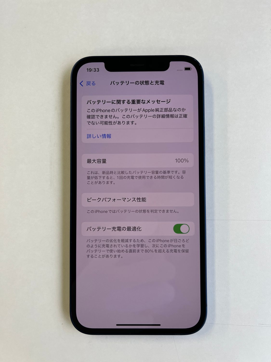 バッテリーの状態表示は正常に行われますが、システム上「純正のApple製部品ではありません」というメッセージが表示される場合がございます。予めご了承ください。