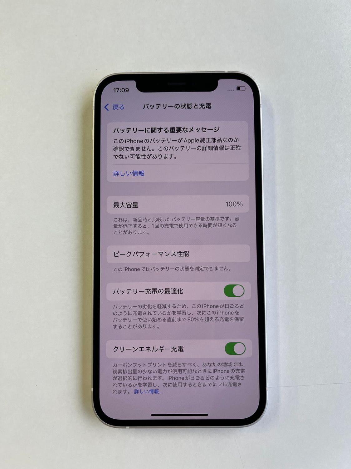 バッテリーの状態表示は正常に行われますが、システム上「純正のApple製部品ではありません」というメッセージが表示される場合がございます。予めご了承ください。