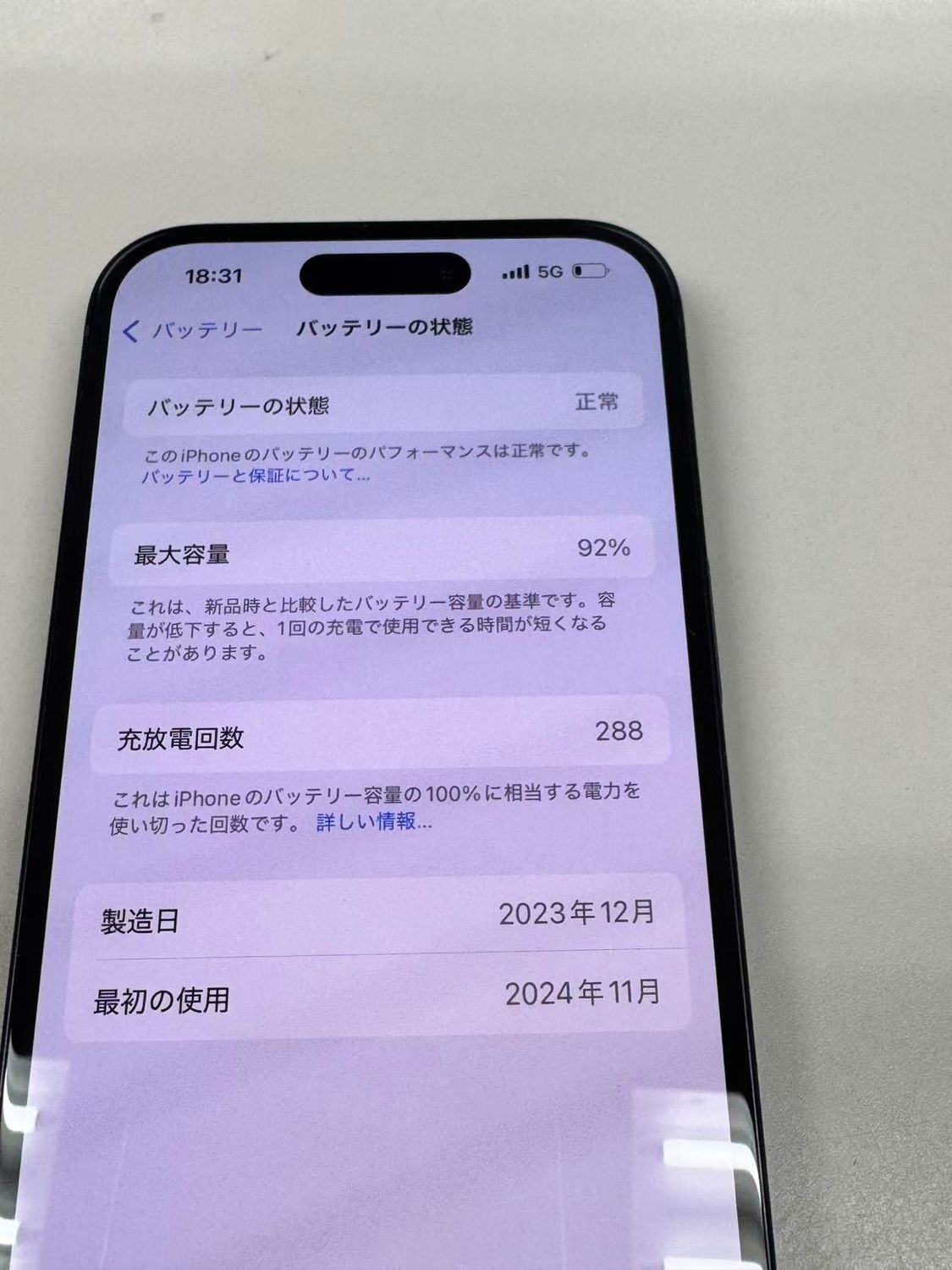 バッテリー最大容量表示:92%