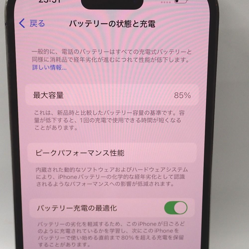 バッテリー最大容量:85%