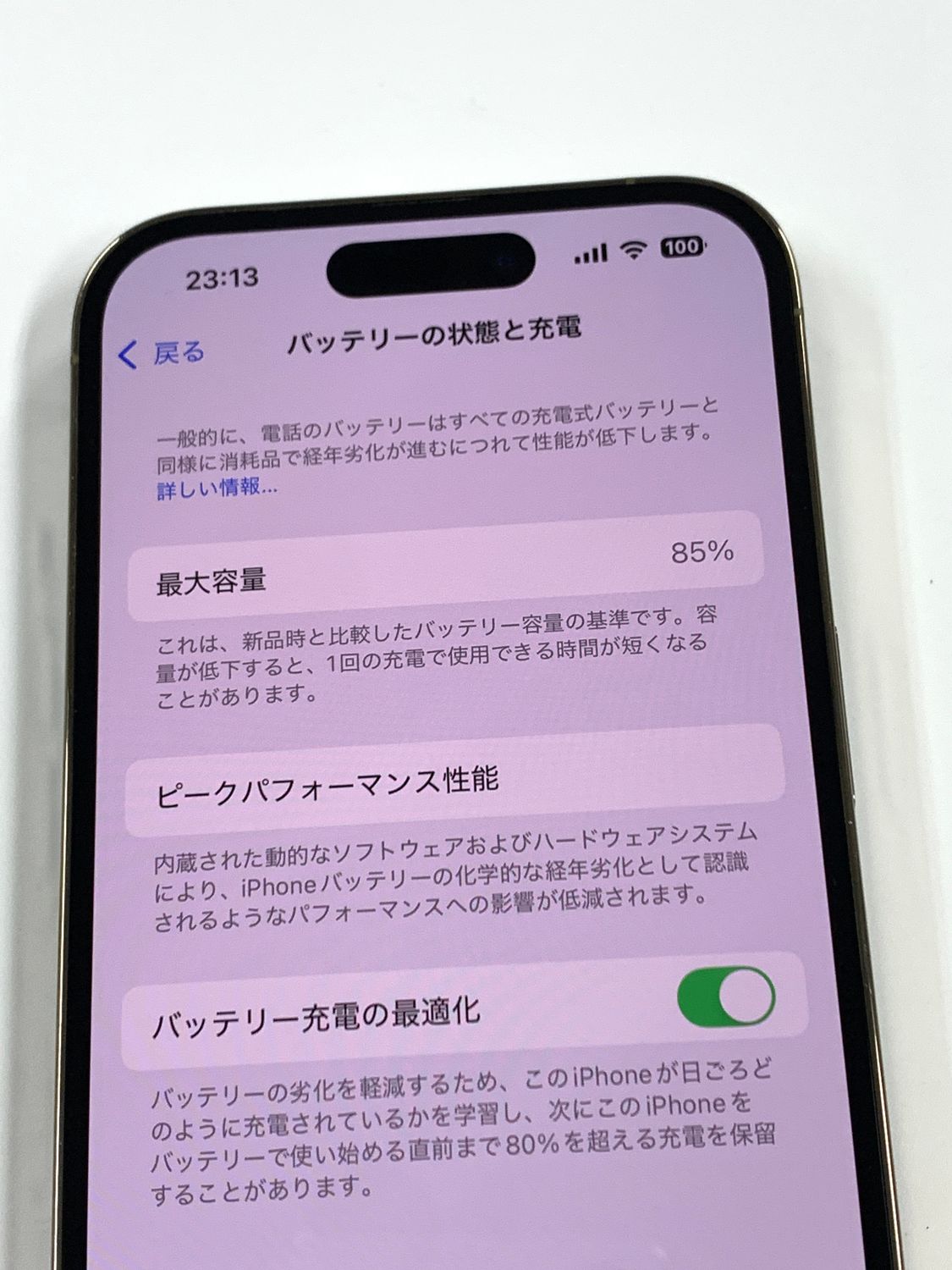 バッテリー最大容量表示:85%