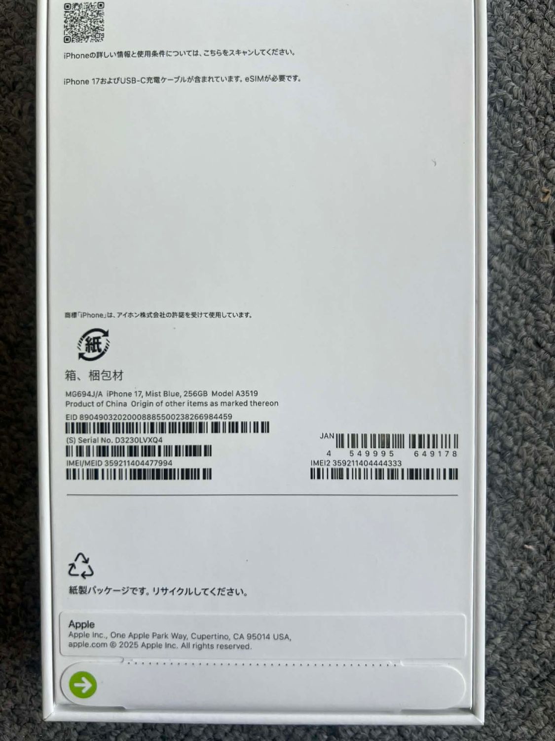 今日発送 新品・未開封 iPhone17 256GB ミストブルー 国内SIMフリー