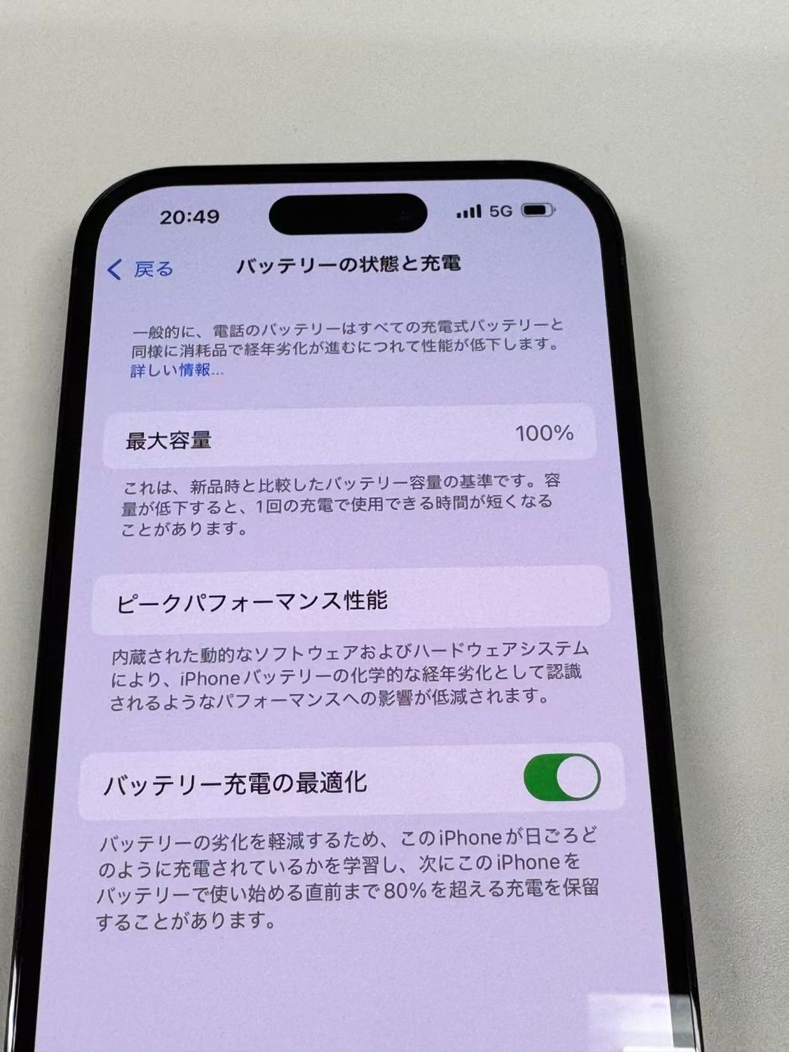 バッテリー最大容量表示:100% 充電回数:0回