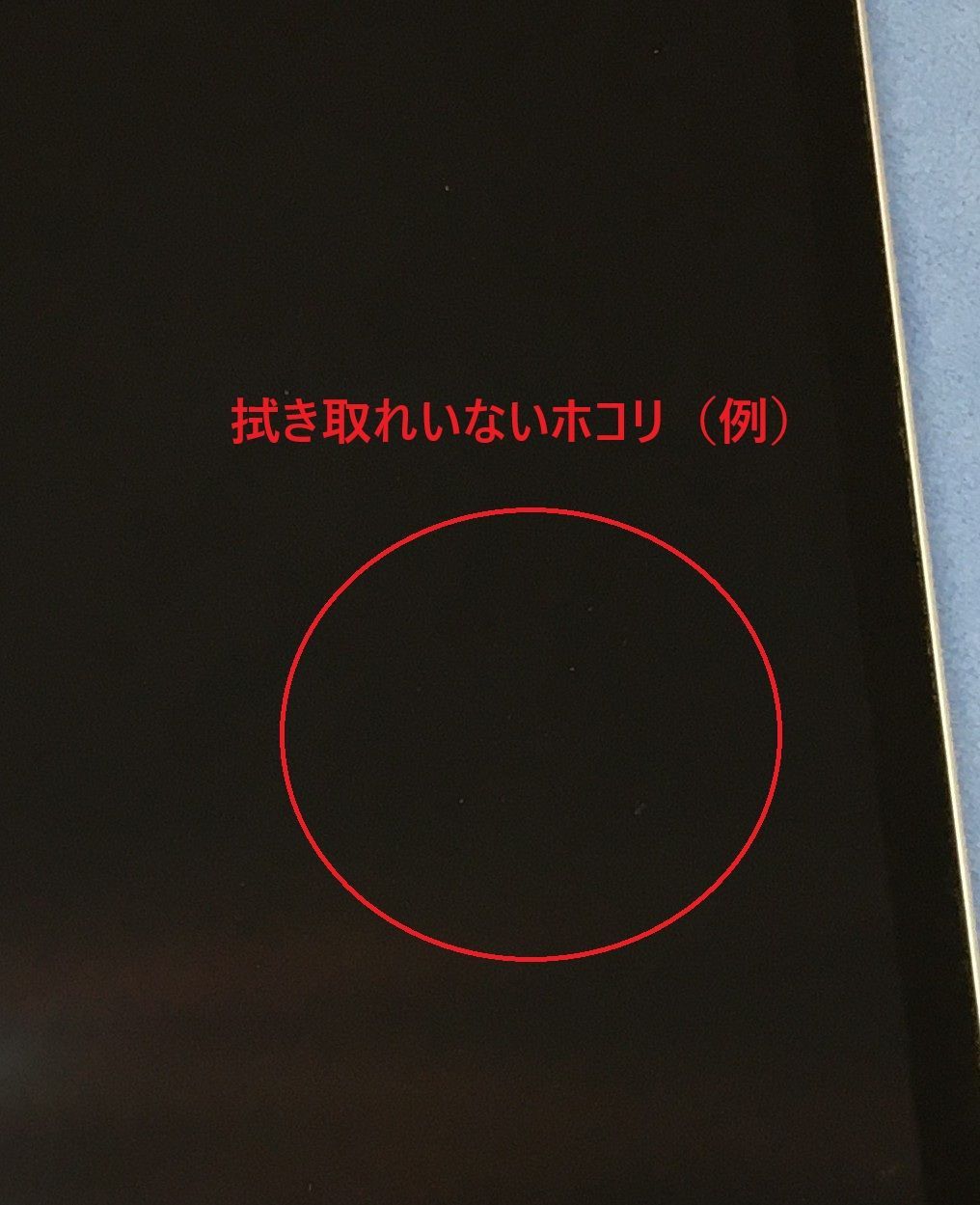 電源ボタンが陥没しており、動作自体は可能ですが少し操作しづらい状態です。液晶内部に若干拭き取れないホコリがあります。タッチ操作や通常使用には影響ありません。