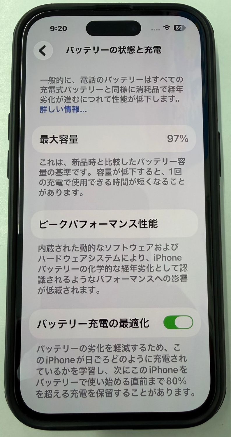 バッテリー最大容量は97%と、まだまだ快適にご使用いただけます。