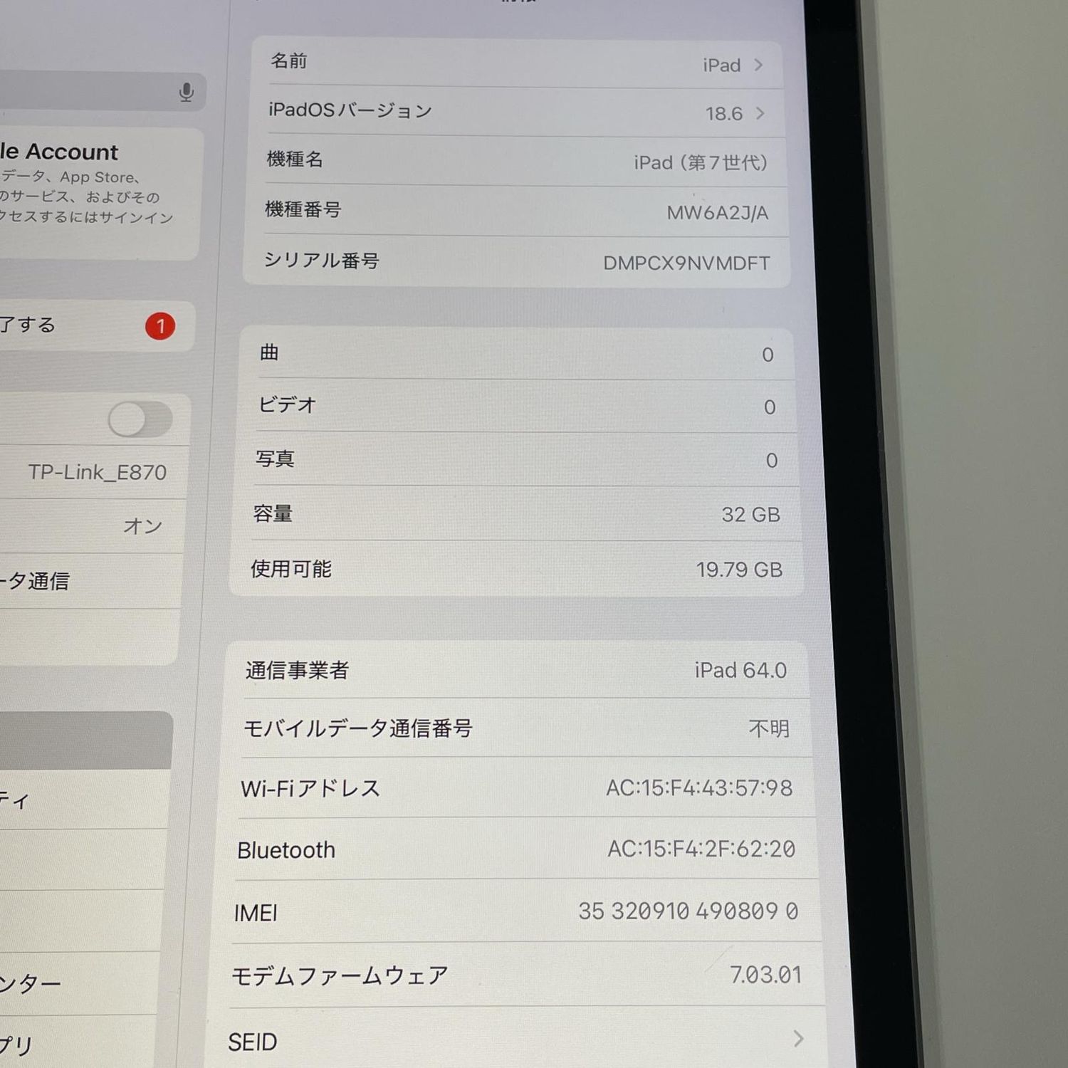| 機種名 | iPad(第7世代) |