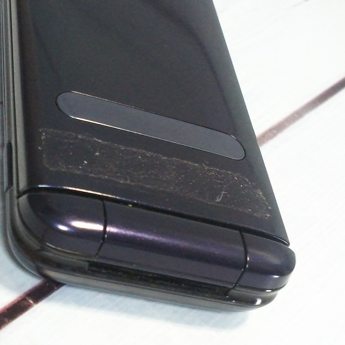 【本体の状態】電源ボタン横にヒビがみられます。そのほか、縁・背面を中心に擦り傷・シール痕、粘着汚れ等の使用感がみられます。画像にてご確認ください。