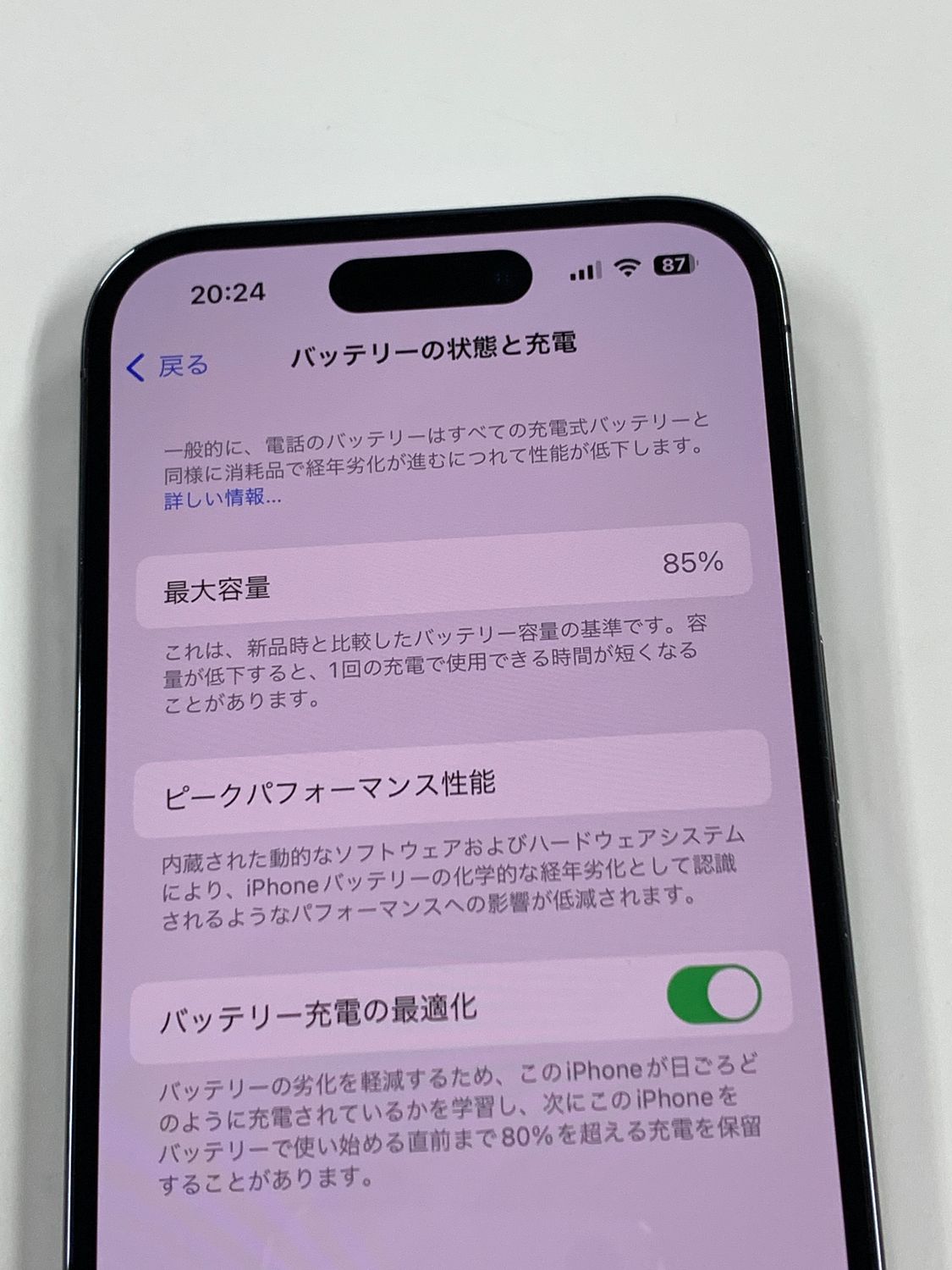 バッテリー最大容量表示:85%