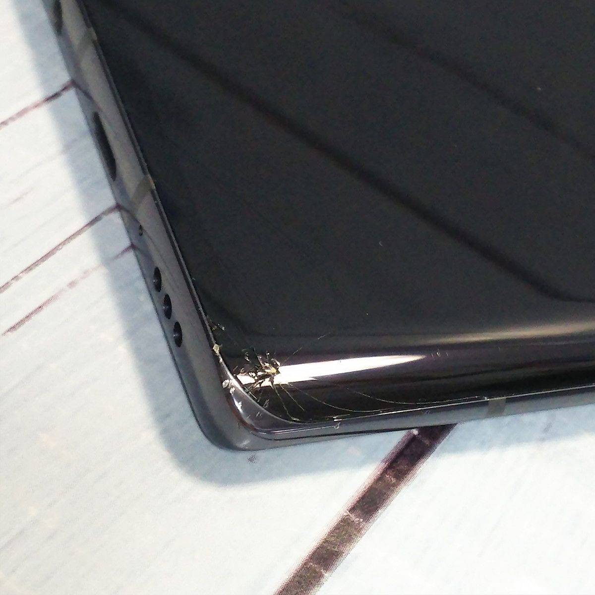 【液晶の状態】下部に割れがみられます。また、擦り傷と若干の色むらがみられますが、検品時点でタッチ操作に影響はありません。