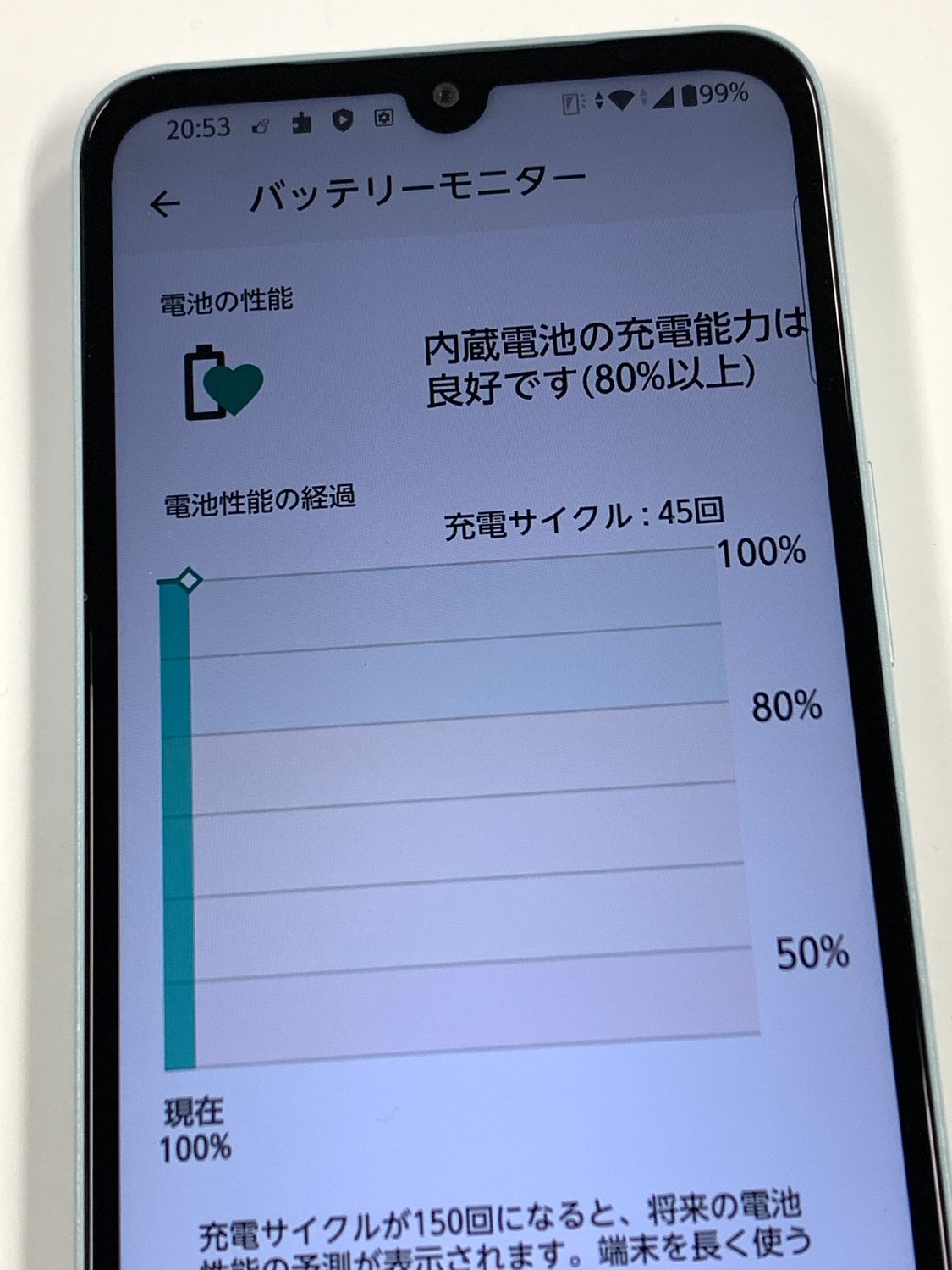 バッテリー最大容量:100%、充放電回数45回