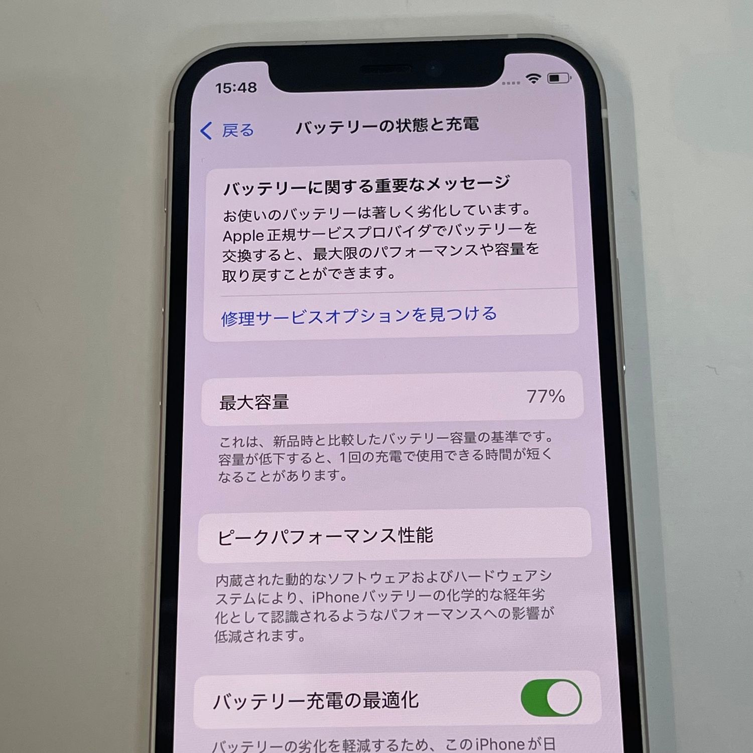 検品時のバッテリーの最大容量は77%、mysoftbankにてSIMロック解除済みです。