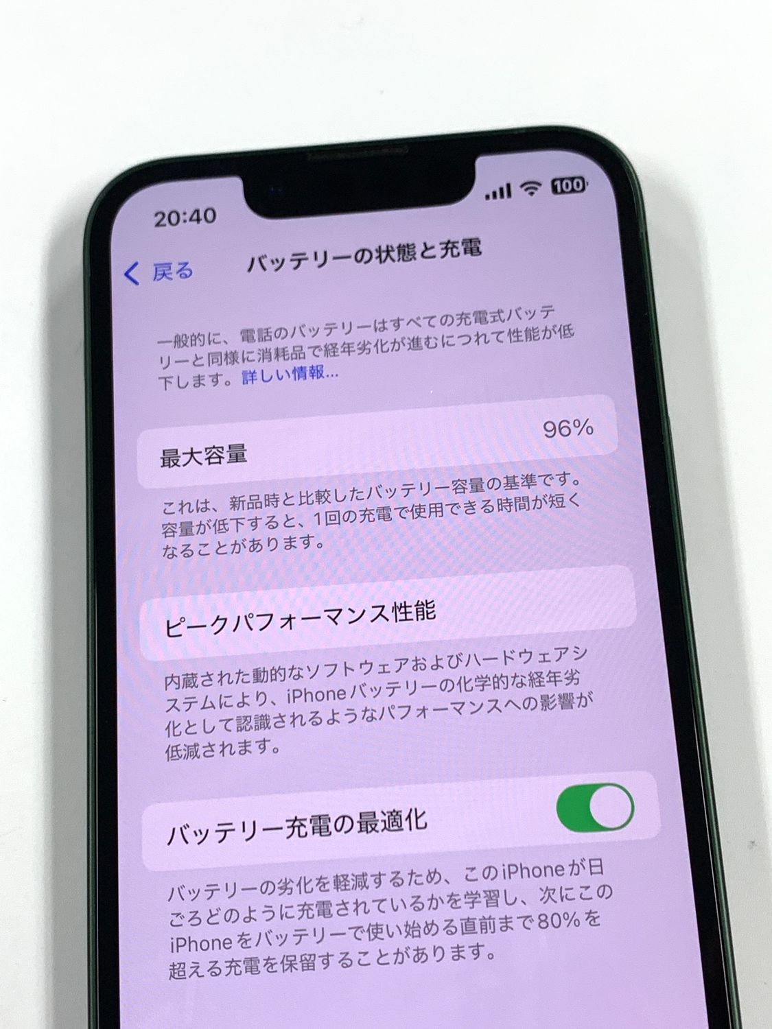 バッテリー最大容量表示:96%(Apple純正部品表示)