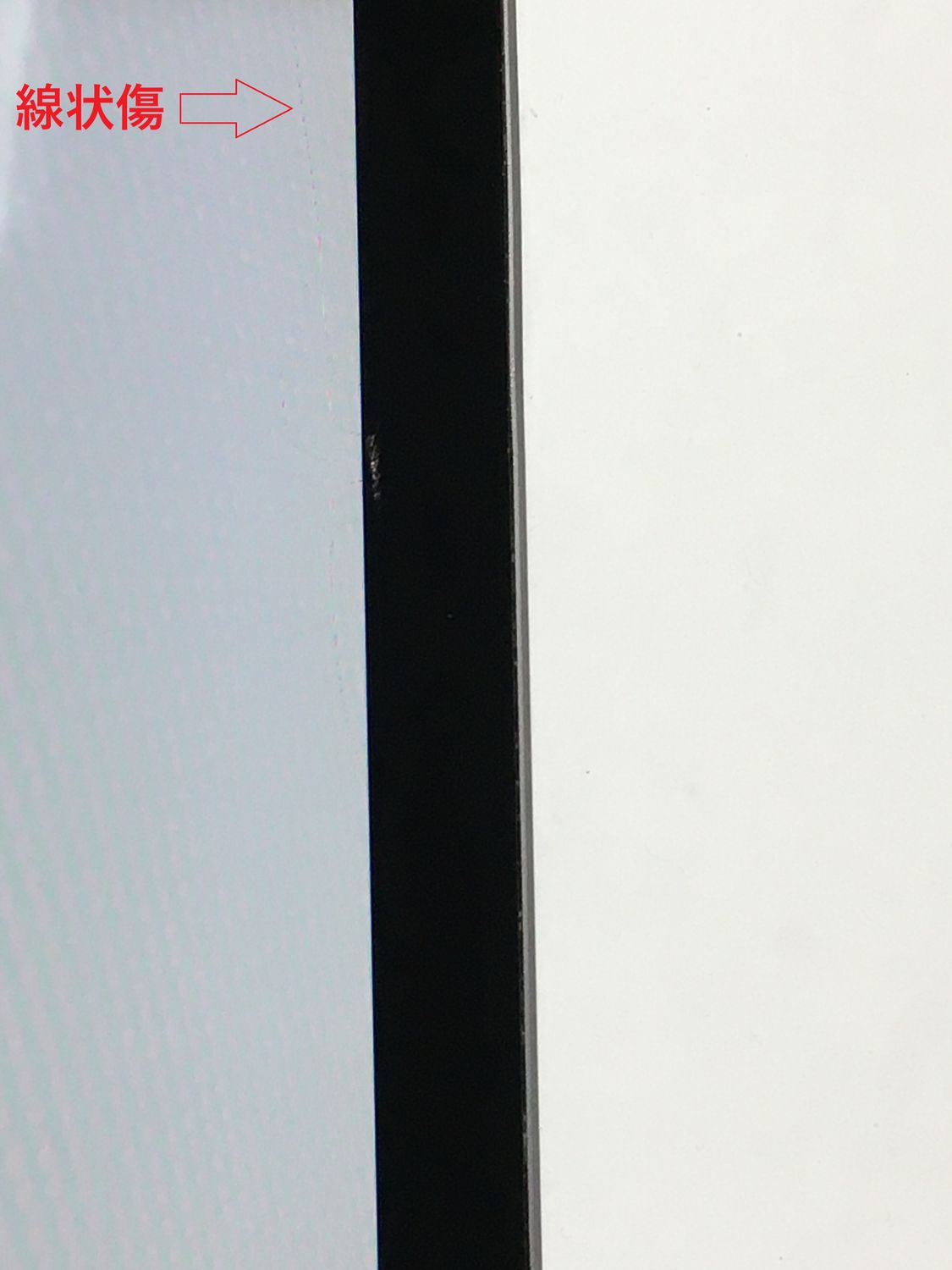 画面内部に線状の傷のような影が2か所確認できますが、動作には問題ございません。液晶内部に拭き取れないホコリがあります。タッチ操作や通常使用には影響ありません。