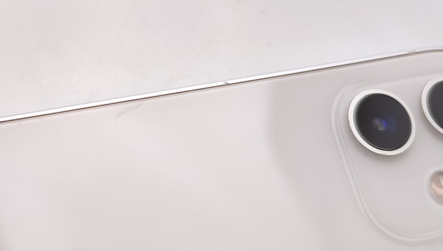 (背面パネルに目立つスリ傷が複数あり、背面カメラ撮影時に小さく薄い黒点が映り込みます。