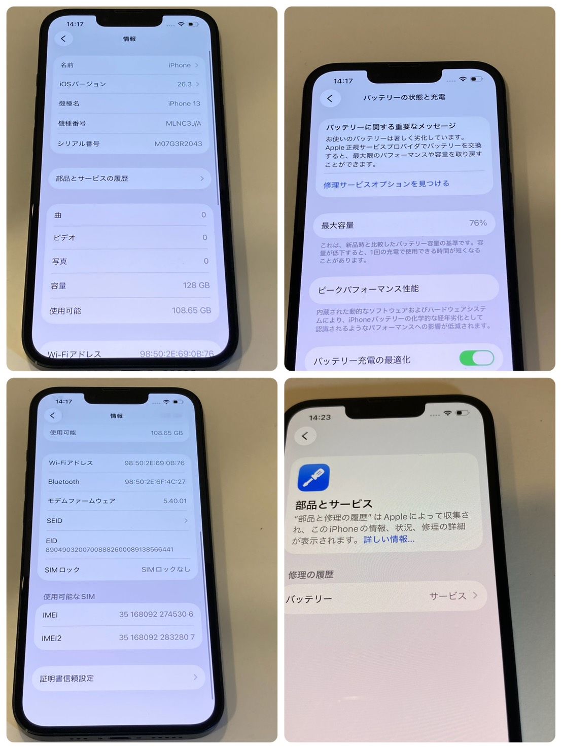 【バッテリーの状態】サービス(76%)(3/10時点) 劣化修理推奨メッセージあり