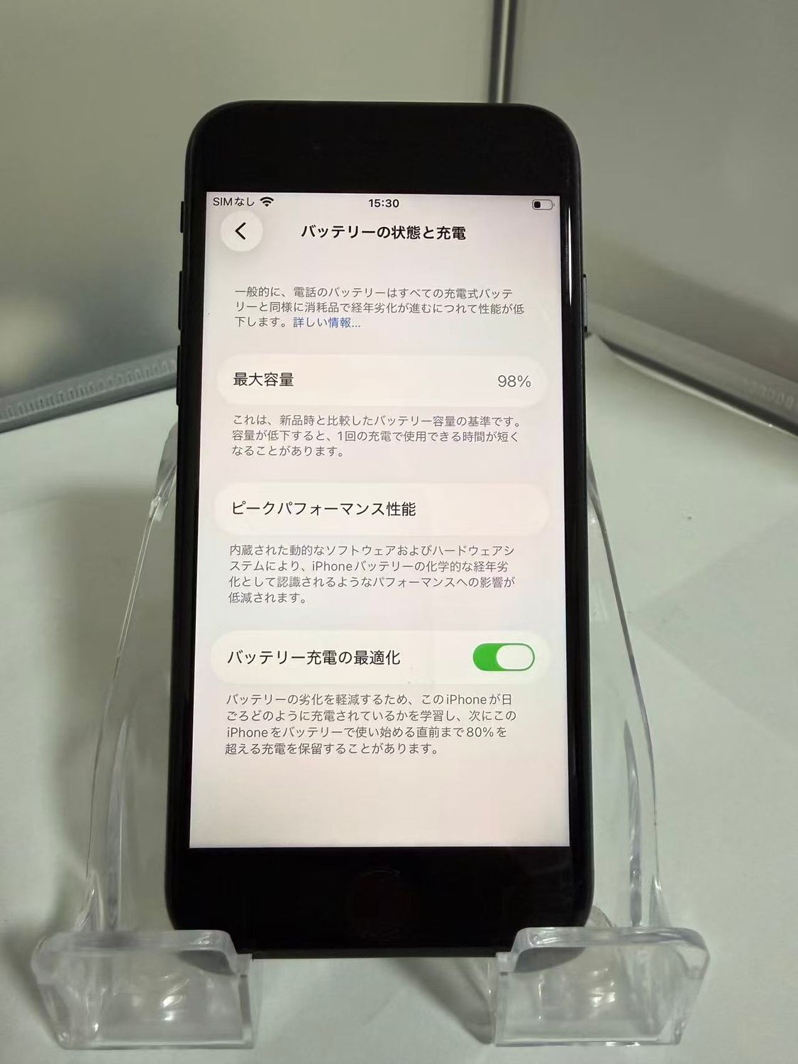 バッテリー最大容量98%: 劣化が非常に少なく、長くお使いいただける状態です。
