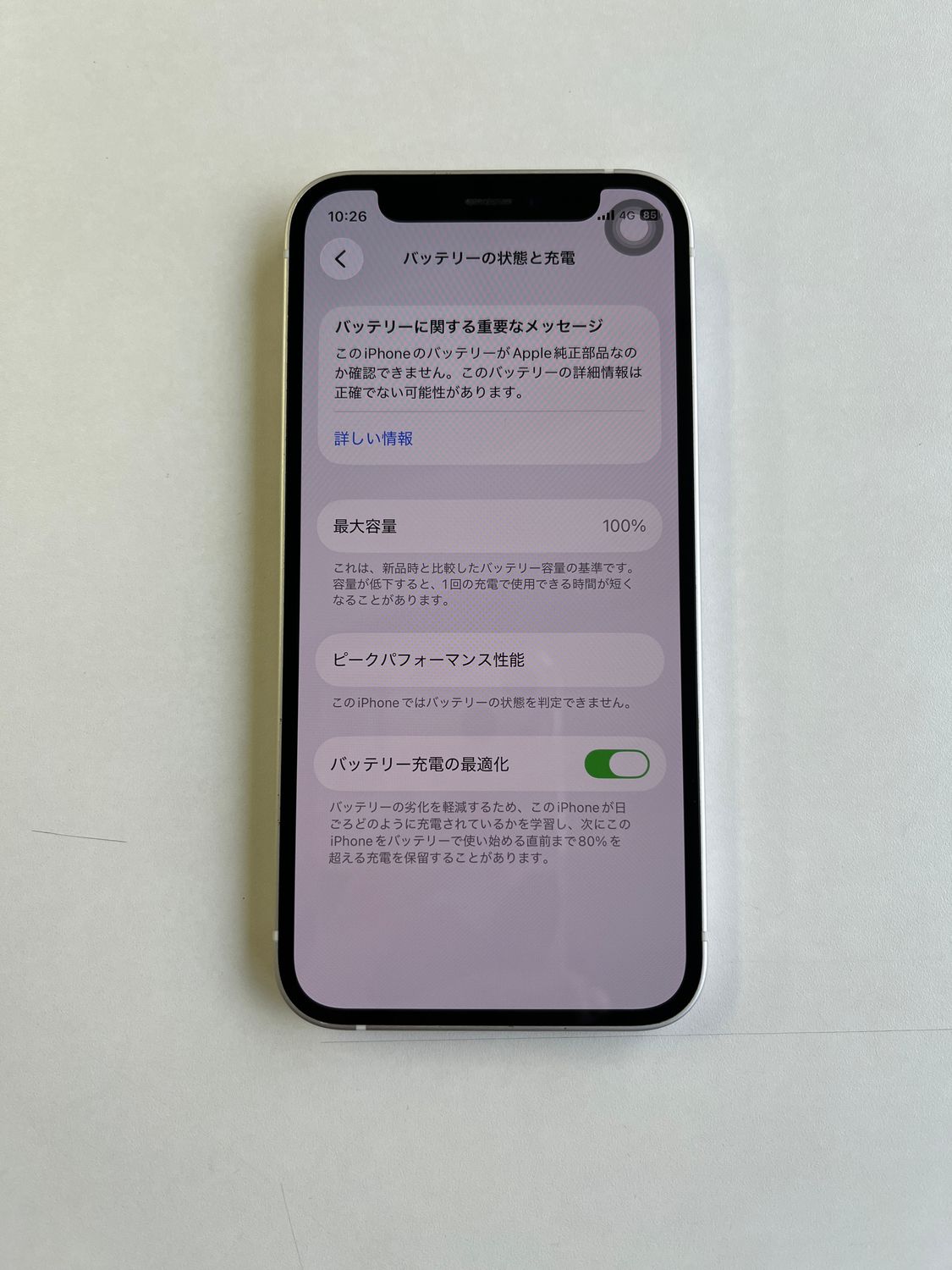 バッテリーの状態表示は正常に行われますが、システム上「純正のApple製部品ではありません」というメッセージが表示される場合がございます。動作には一切問題ございません。