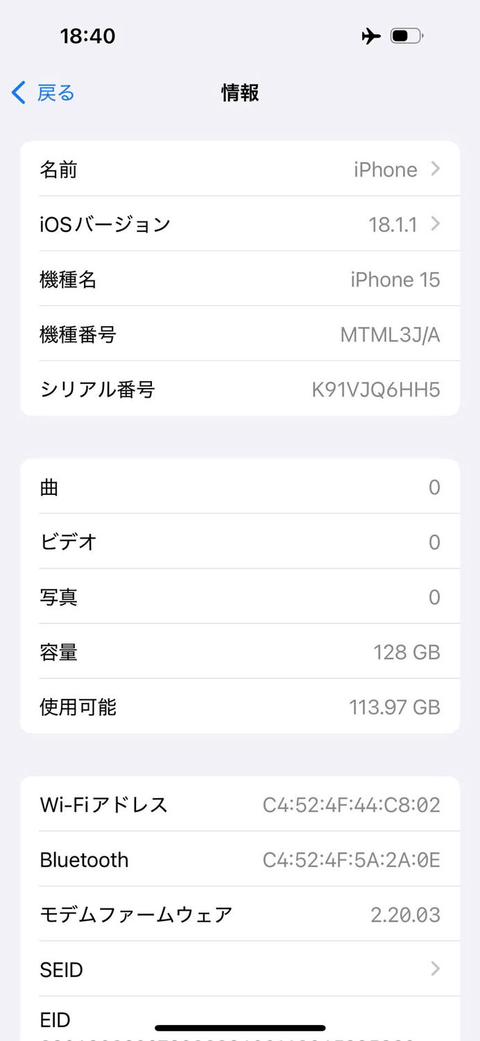 | 機種名 | iPhone15 |