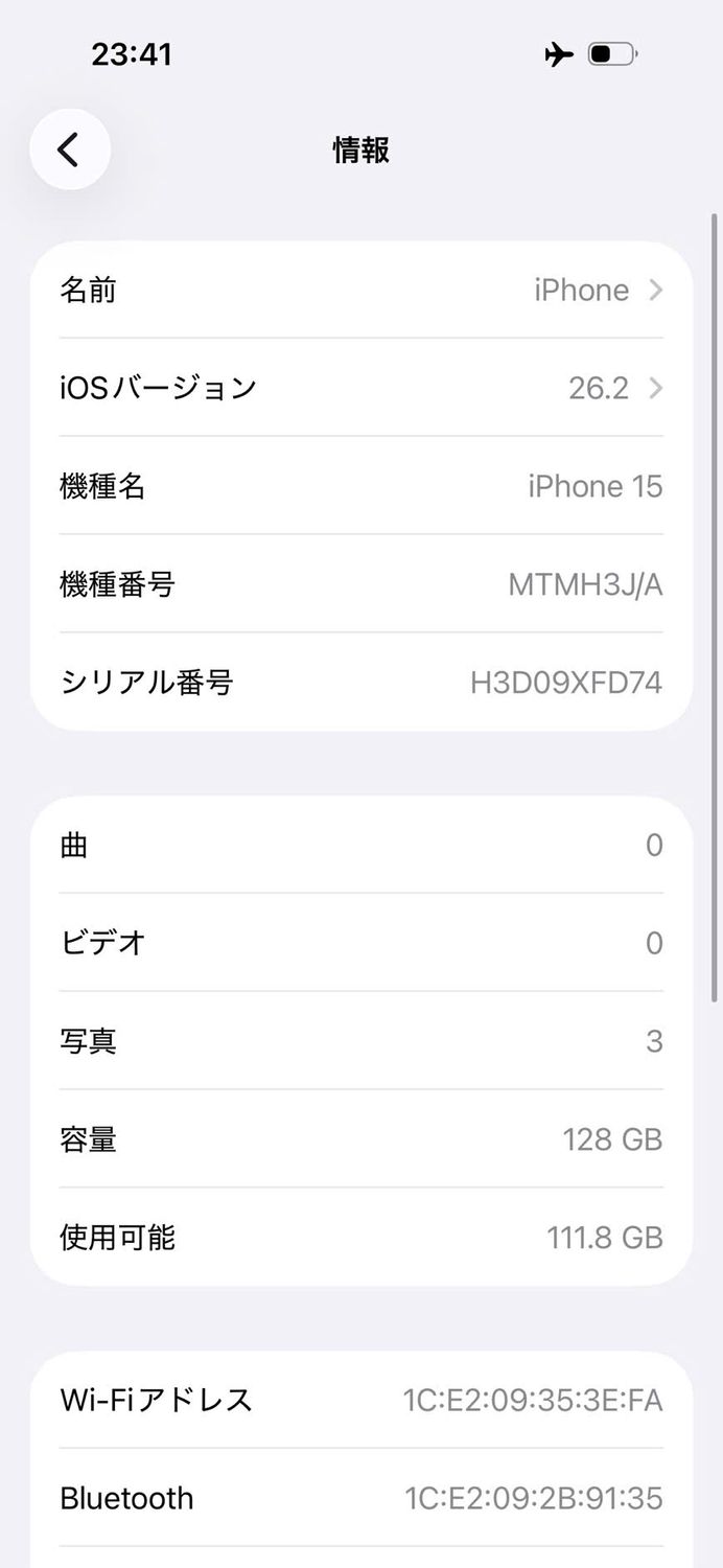 | 機種名 | iPhone15 |