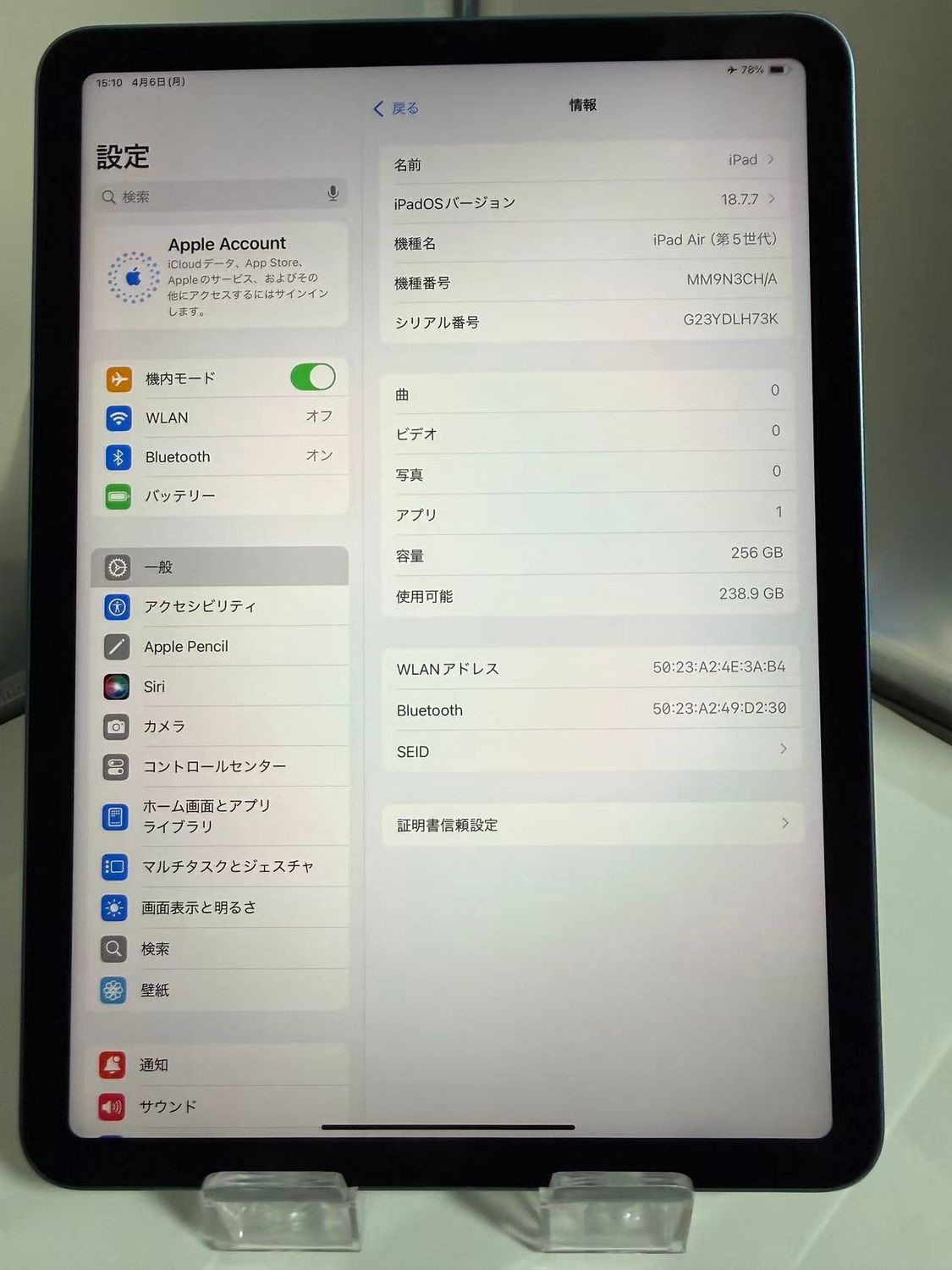 機種: iPad Air(第5世代)Wi-Fiモデル (A2588)