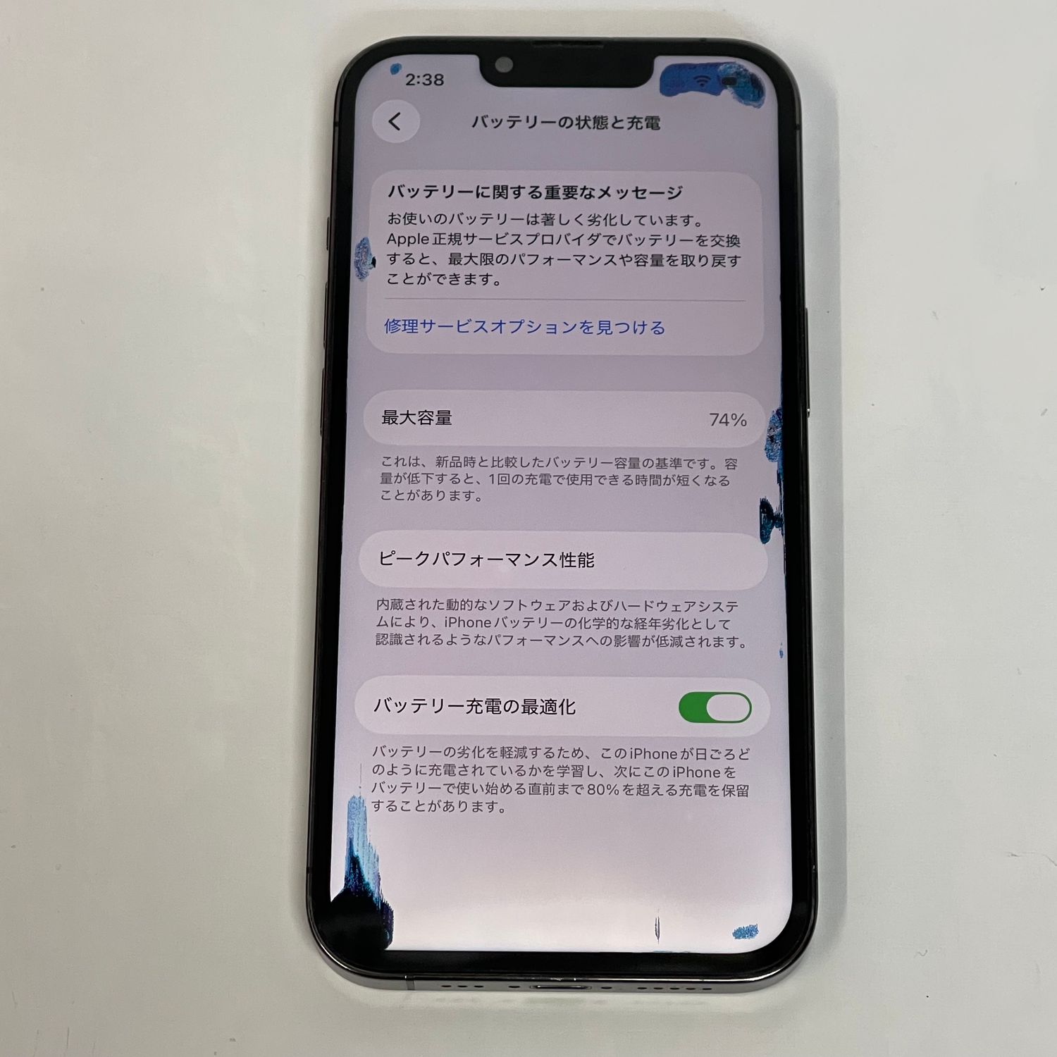 検品時のバッテリー最大容量は74%、SIMフリー端末になります。