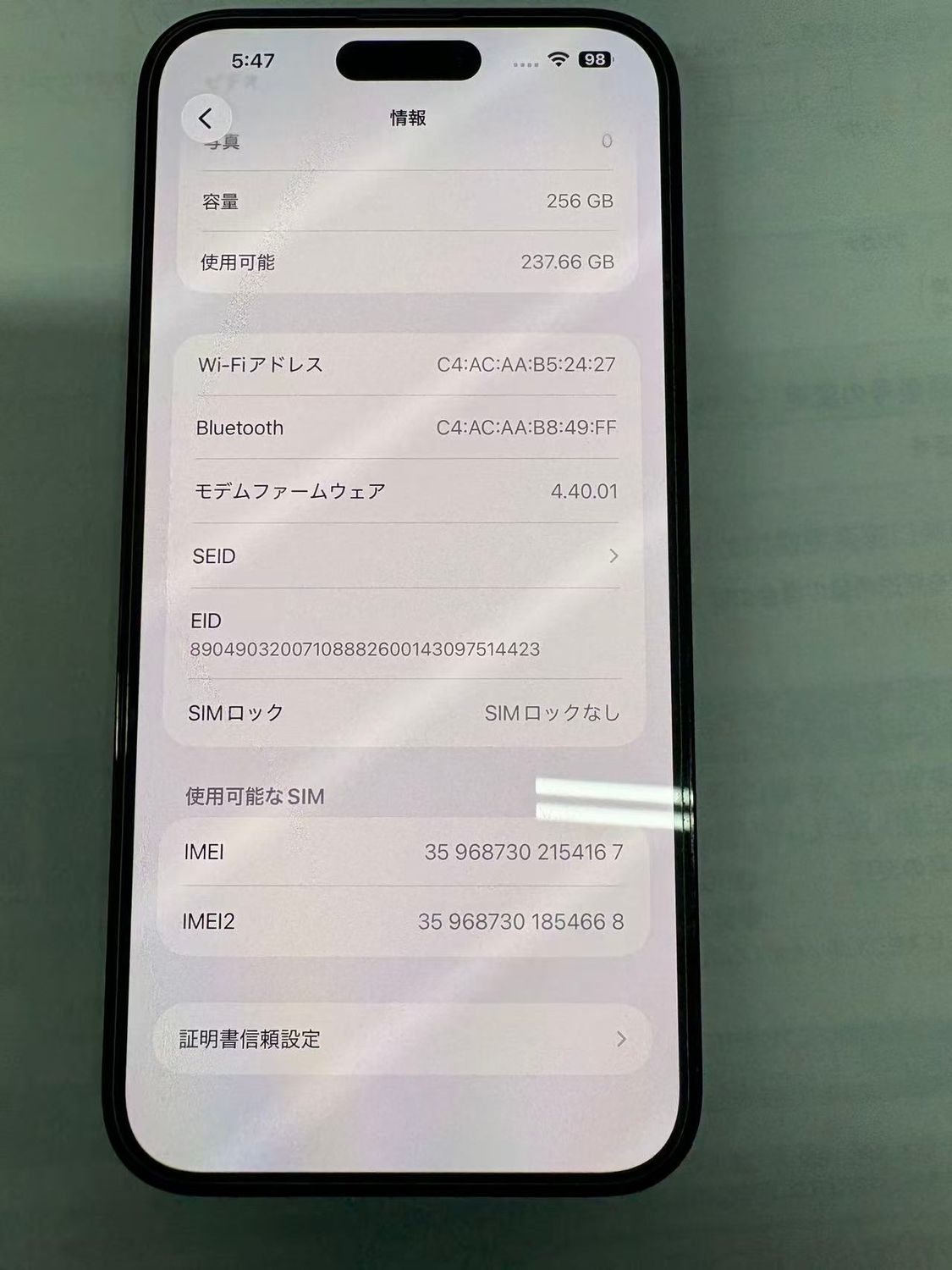 | IMEI番号 | 359687302154167 |