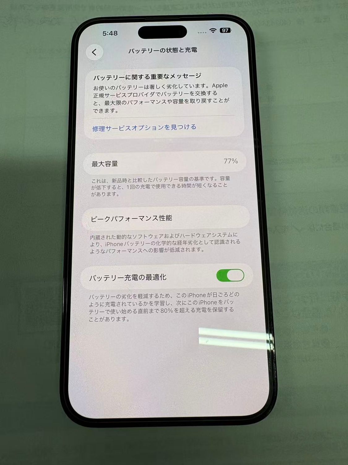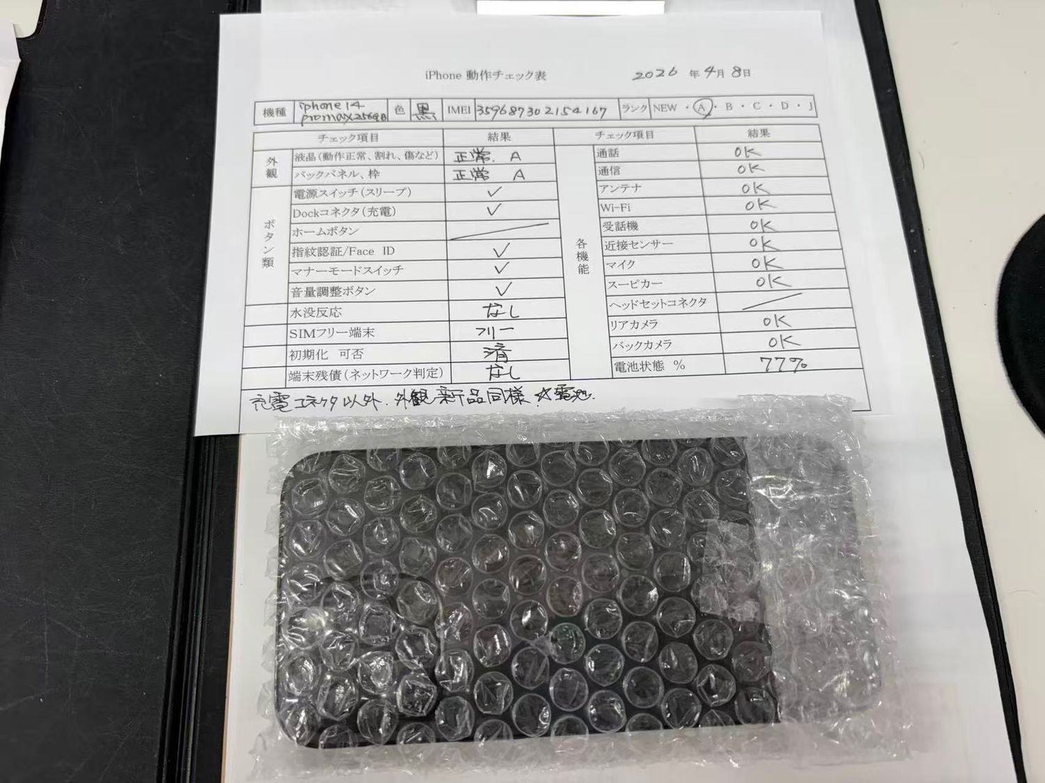 表面ガラスに保護フィルム貼ったまま。外観には充電コネクタ以外、新品同様綺麗。